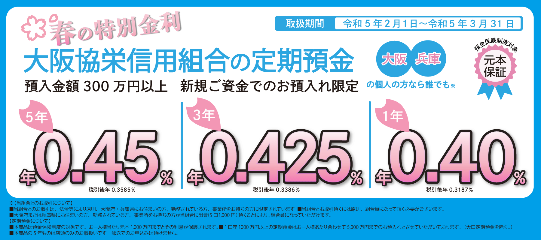 春の特別金利といたしまして、新規ご資金でのお預入れ限定で、定期預金の利率を適用させていただきます。